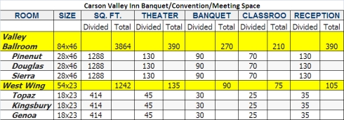For meetings, conventions, banquets and receptions in Minden Nevada, the Carson Valley Inn offers variety, value and versatility! Our 3,864 sq. ft. Valley Ballroom is ideal for groups up to 250 depending on your layout and other requirements. Or, we can divide the Valley Ballroom into one or two thirds for a smaller event. Our West Wing also divides into thirds and is perfect for breakout meetings, smaller dinners, seminars and more.