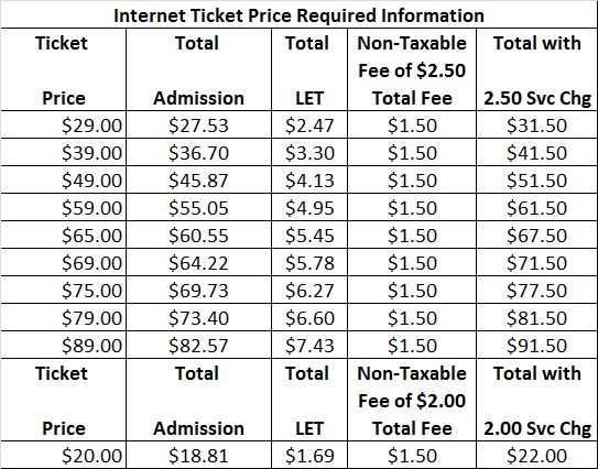 - There is a $2.50 service fee per-ticket added to all transactions. The amount may vary on specific concerts.